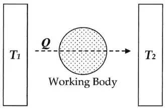 In modern terminology, that is, the terminology introduced by Clausius himself in 1865, we think of this equivalence-value as "entropy", symbolized by S. Thus, using the above description, we can calculate the entropy change ΔS for the passage of the quantity of heat Q from the temperature T1, through the "working body" of fluid, which was typically a body of steam, to the temperature T2 as shown below: