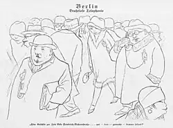 Fiction anticipated the development of real-world mobile telephones. In 1906, the English caricaturist Lewis Baumer published a cartoon in Punch entitled "Forecasts for 1907"[4] in which he showed a man and a woman in London's Hyde Park each separately engaged in gambling and dating on wireless-telegraphy equipment.[5] Cartoonist W. K. Haselden published The Pocket Telephone: When Will It Ring? in 1919, depicting six awkward possibilities.[6][7] In 1923, Ilya Ehrenburg casually listed "pocket telephones" among the achievements of contemporary technology in a story in his collection Thirteen Pipes (Russian: Тринадцать трубок).[8] In 1926, the artist Karl Arnold drew a visionary cartoon about the use of mobile phones in the street, in the picture "wireless telephony", published in the German satirical magazine Simplicissimus.[9] The popular American cartoon detective Dick Tracy acquired a two-way, atomic-battery-powered wrist radio in 1946, upgraded to a wrist TV in 1964.[10]