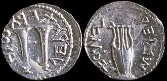 Another stringed instrument of the harp class, and one also used by the ancient Greeks, was the lyre. A similar instrument was the lute, which had a large pear-shaped body, long neck, and fretted fingerboard with head screws for tuning. Coins displaying musical instruments, Bar Kochba Revolt coinage, were issued by the Jews during the Second Jewish Revolt against the Roman Empire of 132–135 AD.