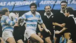 That same year, Los Pumas played the All Blacks, who were doing a tour of the country to play a series of matches in October and November. Argentina lost the first match by 33–20. Nevertheless, the national side achieved a historic 21–21 tie on November 2 at Ferro C. Oeste, with all points converted by Hugo Porta. The line-up for that notable match was Diego Cash; Alejandro Cubelli, Fernando Morel; Eliseo Branca, Gustavo Milano; Tomás Petersen, Jorge Allen, Ernesto Ure; Guillermo Holmgren, Hugo Porta (c); Pedro Lanza, Diego Cuesta Silva, Fabián Turnes, Juan Lanza, Bernardo Miguens.[29] Due to those results, some journalists widely regard 1985 as the best year in Los Pumas' history.[30]