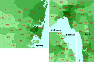 As in previous years, the Greens' vote was strongest in inner-city seats, including Melbourne (22.7% of primary votes), Sydney (20.7%), Grayndler (18.7%), Denison (18.6%) and Batman (17.2%).[19] Strong votes were also recorded in Liberal-held city based seats such as Higgins (10.8%), Kooyong (11.8%) Curtin (13.4%) and Wentworth (15.0%). The primary vote for the Greens in suburban and regional areas was generally smaller.