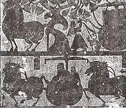 After this defeat, the soldier and adviser Lou Jing—who had previously warned the emperor of the Xiongnu's strength and suffered imprisonment for it—convinced the emperor to create a peace treaty and marriage alliance with the Xiongnu, initiating the Western Han's heqin policy.[41] By this arrangement established in 198 BCE, the Han hoped to modify the Xiongnu's nomadic values with Han luxury goods given as tribute (silks, wine, foodstuffs, etc.) and to make Modu's half-Chinese successor a subordinate to grandfather Gaozu.[42] The exact amounts of annual tribute as promised by Emperor Gaozu given to the Xiongnu in the 2nd century BCE shortly after the defeat are unknown. In 89 BCE, however, Hulugu Chanyu (狐鹿姑; r. 95–85 BCE) requested a renewal of the heqin agreement with the increased amount of annual tribute at 400,000 L (11,350 U.S. bu) of wine, 100,000 L (2,840 U.S. bu) of grain, and 10,000 bales of silk; thus previous amounts would have been less than these figures.[43]