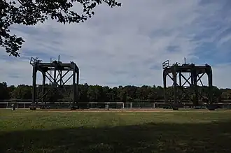 The Hog Island Cranes, located in Trenton, New Jersey, are two of 28 locomotive steam gantry cranes built in 1917 by the McMyler-Interstate Company of Cleveland, Ohio, for the Hog Island, Philadelphia, shipyard. They helped produce warships during World War I, are representative of an important era of heavy lifting equipment, and played an important role in 20th-century waterfront technology. They were added to the National Register of Historic Places on June 17, 1980, for their significance in commerce, engineering, industry, and transportation.[3]