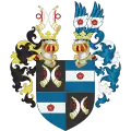 The Hohenfelder inherited the Symaninger titles and lands in the 13th century and quartered their own rose arms, in the second and third position, with theirs (sable, two horns argent with backs to each other facing downwards roped gules and banded or), in the first and fourth position.[Note 5]