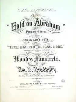 "Hold on Abraham!" is a popular song dating from 1862, during the time of the American Civil War. The song is fast-paced and repetitive, and, at the time of its popularity, was often performed by minstrels. The words and lyrics were composed by William Batchelder Bradbury.