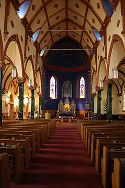 The present church, the fifth for the parish, was erected in 1881. Canadian architect Joseph Connolly designed it in the Gothic Revival style. The church was extensively remodeled in three phases from the mid-1980s to the mid-1990s. The present rectory was added in 1922.