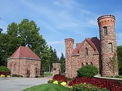 All Souls Chapel is an historic chapel located in the east division of Holy Sepulchre Cemetery.[3] Built in 1876, commissioned by Bishop Bernard McQuaid, and designed by Andrew Jackson Warner, this chapel embodies the Early English Gothic style of architecture. It is constructed of Medina sandstone and contains stained glass windows by P. Nicholas of Holland.[4] The interior features ornate hammer beams hand carved by local carpenter Dominic Mura.[4] The altar is a white marble trimmed in black marble and a base of Tennessee pink marble built by the Hall Company of Boston.[4] Several ornate ceiling panels and other intricate adornment throughout the structure was completed by artist Chester F. Leiderson.[4] The lower level of the chapel contains a morgue initially used for storage of bodies that could not be buried when the ground was frozen.[4] In addition, a series of crypts were constructed for the burial of the Bishops of the Roman Catholic Diocese of Rochester, New York.[4]