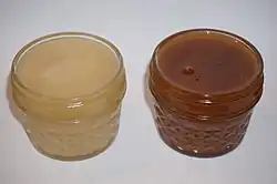 Creamed honey: the honey on the left is fresh, and the honey on the right has been aged at room temperature for two years. The Maillard reaction produces considerable differences in the color and flavor of the aged honey, which remains edible.