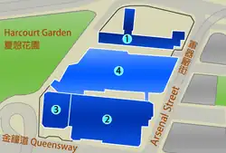 The new complex (main building) project launched in 2002 and completed in 2004. It cost two billion dollars. On 12 March 2005, the opening ceremony was held by the Hong Kong Chief Executive Donald Tsang, Security Bureau Ambrose Lee Siu-kwong and Commissioner of Police Lee Ming-kwai.[4] This new complex is named as "Arsenal House". The former building with the same name are converted from Arsenal House to Arsenal House (East Wing).[5]