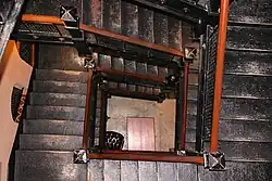 The Hopkins County Courthouse was built in the Romanesque Revival architectural style with red sandstone and pink granite.[4][5] It also features an unusual double-helix staircase with cast-iron stairs as well as marble wainscoting, masonry interiors, oak woodwork, and stone and tile flooring.[2] The building was constructed with a clockless tower because, as one of the town's early leaders declared, "[i]f you get up when the sun rises and go to bed when it sets, you don't need a clock."[3]