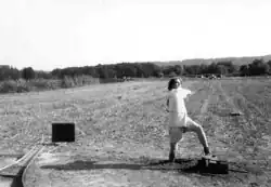 A game of Hornussen is played between two teams, each composed of between 16 and 20 players, that take turns in hitting the 78 g (2.8 oz) Nouss from the "Bock" and defending the trapezoidal playing field called Ries. The "Ries" begins 100 m (330 ft) from the "Bock" and is 180 m (590 ft) deep. Initially 8 m (26 ft) wide, it widens to 14 m (46 ft) at the far end.[3] A pair of turns, one at the Bock and one in the Ries by each team forms a Durchgang ("transition"), analogous to an innings in sports such as baseball or cricket. A normal championship game is made up of two transitions, special events (such as the regional or inter-cantonal tournaments in autumn) might be different.