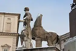 The colossal pair of marble "Horse Tamers"—often identified as Castor and Pollux—have stood since antiquity near the site of the Baths of Constantine on the Quirinal Hill, Rome. Napoleon's agents wanted to include them among the classical booty removed from Rome after the 1797 Treaty of Tolentino, but they were too large to be buried or to be moved very far.[1] They are fourth-century Roman copies of Greek originals. They gave to the Quirinal its medieval name Monte Cavallo (Italian for 'Horse Mountain'), which lingered into the nineteenth century. Their coarseness has been noted, while the vigor—notably that of the horses—has been admired. The Colossi of the Quirinal are the original exponents of this theme of dominating power, which has appealed to powerful patrons since the seventeenth century, from Marly-le-Roi to Saint Petersburg.