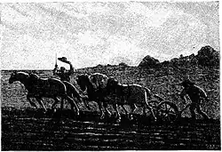 The special cultural status accorded to the horse in Brittany stems from the fact that farmers have always been very attached to this animal. Until the beginning of the 20th century the horse was part of the family.[1] Used as a means of locomotion, it was associated with all of life's events. Its presence in large numbers at popular gatherings, such as pardons, fairs or even weddings, was also an opportunity to organize cavalcades and races.[2] It's both a work tool and a source of pride.[3] Farm size is even measured in terms of the number of horses.[4] According to Éphrem Houël, this pride is so great "that it is not uncommon to see, on market days, very lightly loaded carts coming to the towns, pulled by five or six strong horses". This custom is especially common in the Léon region.[5] Paul Sébillot relates a proverb: "Bon dieu d'en haut, prends ma femme, laisse les chevaux" (Take my wife, leave the horses).[3] For Breton people, Landivisiau is also a symbol of the horse trade.[6] The link with the legends of Brittany is permanent. Éphrem Houël links the regions where chivalry is celebrated with the quality of horse breeding:[7][8]