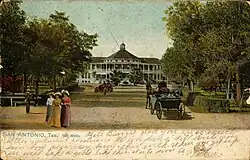 By 1902, according to a Souvenir of the City of San Antonio, the three-story Hot Wells Hotel had 80 rooms with modern conveniences including first-class furnishings, individual telephones to the main office, steam heat, electric and gas lights, and hot and cold water.[2] The octagonal bathhouse had 45 private bathrooms each with porcelain tubs, marble partitions and tile floors. Guests were segregated by sex for Roman, Russian or Turkish, steam, needle and shower baths. The water ran at 104 degrees but could be individually controlled. Three public pools (64 feet by 90 feet each) were lined with white enameled brick.[2] The Hot Wells spa was reputed to have better water quality than either the then-popular Hot Springs, Arkansas or the then-acclaimed Carlsbad, Germany spas. As elsewhere, bathing was dissuaded if suffering lung problems—it was thought the water's warmth would cause suffocation by "clos[ing] the lungs." Syphilis sufferers were made to bathe privately.[2] In addition to swimming parties, there were domino parties, concerts and lectures there during these early years. The Hot Wells Bowling Club played on nine- and ten-pin alleys.[19] There seems to have been a long tradition of Friday night dances at the Southwestern Insane Asylum where hotel guests frequently fraternized with and without patients present.[19][20]