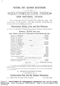 An artesian well was discovered on land then owned by the Southwestern Lunatic Asylum (also known as the Southeastern Insane Asylum, now known as the San Antonio State Hospital) in 1892—the same year the hospital opened.[2] Intended to provide water for the asylum, the well was dug 1750 feet deep and yielded 180,000 gallons of water per day. But the water had a temperature of 103-104 degrees Fahrenheit and smelled strongly of sulphur.[4] It was found unfit for daily use by the facility so the sulphur water was leased to Charles Scheuermeyer who became a pioneer in the field of water resources development and the earliest to emphasize the medicinal properties of the local sulphur water. As analyzed by G.H. Wooton, a chemist at the State University in Austin, the mineral waters aided in the relief of blood poisoning, kidney, liver and skin diseases and rheumatism.[2] Scheuermeyer placed a full-page ad in San Antonio's 1892-93 city directory for his Natural Hot Sulphur Natatorium at the Southwestern Park.[5]