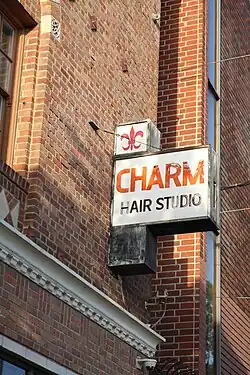 Original signage from a barber shop that once occupied part of the hotel's retail space