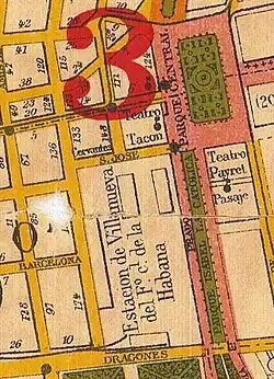 Partial map of Havana showing the Villanueva railway station and the Paseo de Isabel before the Capitol and Hotel Pasaje were built.