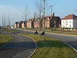 There are several community features in the development. Dollman Farm is a restored farmhouse which greatly pre-dates the new estate and is used as a visitor information centre.[4] The Barn is a community centre/village hall which holds communal classes and clubs and can be hired for parties or events.[5] The Tuning Fork is a restaurant/cafe which is open to the public.[6] Nearby is a large adventure play area. Finally a new primary school has been opened, St Gabriel's CofE Academy,[7] named after the patron saint of communications.