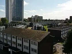 A housing estate in Camden Town, London, with two blocks of flats visible