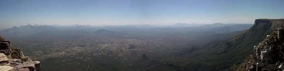 Its western edge forms the natural boundary between the Huíla and Namibe Provinces, roughly extending from Chongorói, Benguela Province, in the north, to Onkokwa, Cunene Province, in the south. This edge is characterized by deep escarpments, such as the Tundavala Gap, and is part of the Great Escarpment. Along this edge are the Serra da Leba and Serra de Chela mountain ranges.[3][4] Beyond this is a desert/beach region along the Atlantic Coast.[5]