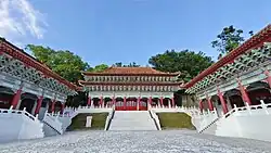 The Hualien Martyrs' Shrine was constructed in the Chinese palace style, which aligns its architectural design with many other Martyrs' Shrines across Taiwan. Upon entering, visitors first encounter a red and white multi-tiered Chinese-style Pailou Gate. This gate features a central plaque inscribed with the words "Martyrs' Shrine" in golden Chinese characters. Beyond the gate lies the "Hall of Righteousness," followed by the main hall known as the "Martyrs' Shrine." Flanking the main hall are two additional buildings: "The Hall of Benevolent Admiration" on the left and "The Hall of Sublime Virtue" on the right.[2]