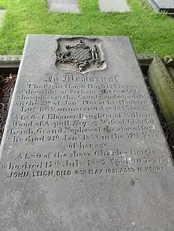 Hugh Willoughby died without issue on 22 January 1765 in London. Though a prominent dissenter, he was buried in the chancel of an earlier Horwich Church on 9 February 1765, the Church was rebuilt further away from the road in 1830, his grave is now within the current Parish Church graveyard .[2] He left his distant cousin, Henry Willoughby, heir to the barony, and property in Rivington and Anglezarke to his sisters, Helen Roscoe and Elizabeth Shaw. In memory of the family there is a monument at Rivington Unitarian Chapel. The Willoughby pew, bearing its original brass nameplate on the south wall of the chapel has been preserved and is noted for its large ornate canopy with panelled reredos and a moulded and carved cornice in the classical style.