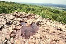 Hughes Mountain is a peak in the St. Francois Mountains Range of southeastern Missouri. These granite and rhyolite rocks of these mountains formed 1.485 billion years ago during the Proterozoic Eon when the area was volcanically active.[8] Hughes Mountain is formed of extrusive rhyolite which fractured into vertical joints when it cooled, creating polygonal columns. These columns have from four to six sides and are up to three feet (0.91 m) tall. When viewed from above they resemble a honeycomb.