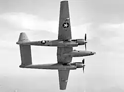 The XF-11 emerged as a tricycle landing gear, twin-engine, twin-boom all-metal monoplane with a pressurized central crew nacelle and a much larger wingspan and higher aspect ratio than the P-38 or the D-2.[1][26] The aircraft was of conventional aluminum alloy construction with flush riveted skin. The wings were equipped with single-slotted Fowler flaps; roll control was provided by mid-chord spoilers at high speeds and by ailerons near the wingtips at low speeds. To provide added fuel capacity and range, hardpoints were mounted under the wings for 700-US-gallon (2,600 L; 580 imp gal) auxiliary drop tanks, and design drawings also indicated provisions for mounting 600-US-gallon (2,300 L; 500 imp gal) auxiliary tip tanks. However, there is no evidence that auxiliary fuel tanks were ever fitted to the prototypes during flight tests.[27]