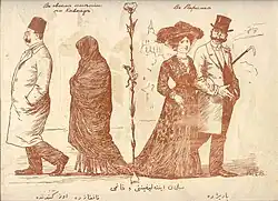 Caricature on Islamic spousal relationship from the Azerbaijani magazine Molla Nasraddin depicting a noble Azeri couple in Paris (right) and on their estate in the Caucasus (left)