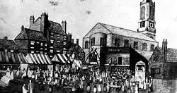 A chapel dedicated to St. Mary the Virgin was built in 1636, and enlarged in 1774. It was a brick structure with a tower. It was enlarged by subscription in 1826.[8] There were two churches built on the site. The Victorian church, of which the spire remains, is the tallest in Leeds, was built in 1864 and the new church building surrounding it was built in the 1970s but was demolished in 2019.