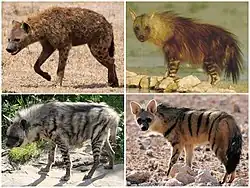 The four extant species of hyena, clockwise from upper left: spotted hyena (Crocuta crocuta), brown hyena (Parahyaena brunnea), aardwolf (Proteles cristata), and striped hyena (Hyaena hyaena)