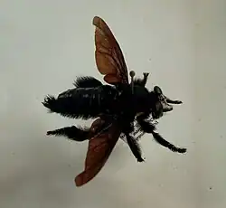Hyperechia is a genus of robber flies in the family Asilidae. They appear large, stout and with legs covered in bristles and appear like carpenter bees in the genus Xylocopa and the resemblance is considered as a case of aggressive mimicry, providing protection from predators. The larvae of the fly feed on the larvae of Xylocopa within their cavity nests in wood.[1] They are mainly found in the African and Madagascan region with about 15 species and two species in Asia.[2][3]