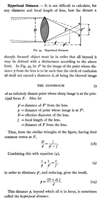 The term hyperfocal distance also appears in Cassell's Cyclopaedia of 1911, The Sinclair Handbook of Photography of 1913, and Bayley's The Complete Photographer of 1914.