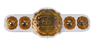 The standard Championship belt has five plates on a white leather strap.