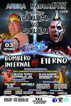For the September 2017 Cabellera vs. Cabellera event IWRG veteran Bombero Infernal faced off against Eterno. Eterno defeated the veteran Bombero Infernal, forcing him to have all his hair shaved off as a result. In the semi-main event match the father/son team Los Warriors (Black Warrior and Warrior Jr. defeated Black Terry and Diablo Jr. to win the IWRG Intercontinental Tag Team Championship for the first time. The show included five additional matches