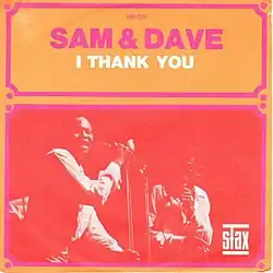 "I Thank You" is a song written by David Porter and Isaac Hayes originally recorded by Sam & Dave, released in early 1968.[1] The single was Sam & Dave's final release on Stax Records, reaching No. 9 on the Billboard Pop singles chart and No. 4 on the R&B chart.[2] Shortly after its release, Stax severed its distribution deal with Atlantic Records and Sam & Dave, who were actually signed to Atlantic and loaned out to Stax, began recording for Atlantic proper.[3] The song begins with Sam's spoken introduction that goes: "I want everybody to get off your seat,/ And get your arms together,/ And your hands together,/ And give me some of that old soul clapping". First, Sam sings the refrain, plus the first verse, and the refrain, while Dave sings the second verse, the refrain, and the third verse, with both Sam and Dave sharing on the repeated "Thank Yous" portion. Following a brief instrumental, Sam sings the refrain, with Dave, joining him, on the Coda with the repeated "thank yous".