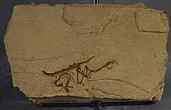 The holotype specimen, LH-22, part of the Las Hoyas Collection, consists of a compressed articulated partial skeleton of an adult individual lacking the skull, the anterior neck and most of the hands. A second specimen, LH-8200, was referred to a Iberomesornis sp. in 1994, consisting of the left foot of an individual similar in size to the holotype.[3] After further preparation of the fossil, the species was redescribed by Paul Sereno in 2000.[4]