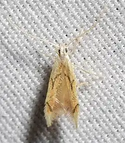 The wingspan is about 10 mm.[4] There are two or three generations per year. The larvae feed on Dichanthelium clandestinum. They skeletonize the leaves of their host plant.[5]