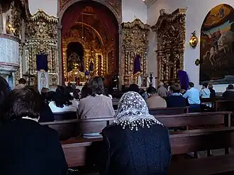 The church has a single nave. It features several altars, especially a high altar, with rich decoration in gilded wood.[1][2]