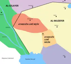 For 270 years, between 1155 and 1424, the reigned the Zagros Mountains, especially areas around Lorestan. Hazaraspids who are also known as Lorestan Atabegs were composed of two groups, the Little Lor, who were mostly of Lor descent and Big Lor Atabegs who were of Kurdish descent. The former controlled parts of present-day provinces of Markazi, Hamedan, Kermanshah, Lorestan, Khuzestan and Ilam.[18]