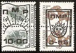 Stamps of the Soviet Union with overprints supposedly from the Pridnestrovian Moldavian Republic. These were produced in 1992 or 1993 without the knowledge or permission of PMR authorities.[1][2]