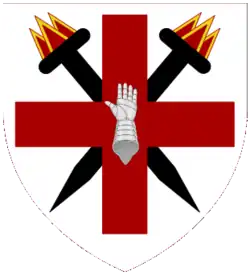 Argent two torches in saltire Sable enflamed Proper surmounted by a cross couped Gules thereon a sinister gauntlet also Proper.