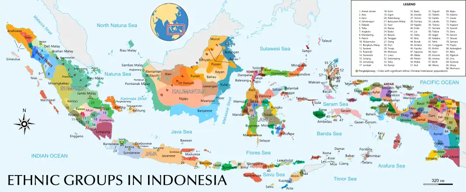 The Indonesian archipelago is characterized by significant ethnic diversity, comprising approximately 600 distinct native ethnic groups.[63][64] The majority of Indonesians are descended from Austronesian peoples, whose languages trace back to Proto-Austronesian, likely originating in present-day Taiwan.[65][66] Another prominent group is the Melanesians, who primarily reside in eastern Indonesia, including the Maluku Islands, Western New Guinea, and the eastern part of the Lesser Sunda Islands.[67][68]