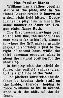 The infield shift strategy is often associated with Ted Williams, yet was first employed against Cy Williams during the 1920s.[1][2][3] Cy Williams, a left-handed outfielder with the Chicago Cubs and Philadelphia Phillies, was second only to Babe Ruth in major league career home runs from 1923 to 1928. Opposing defenses would shift "practically to the entire right side" when he batted.[4]