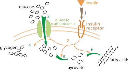Effect of insulin on glucose uptake and metabolism. Insulin binds to its receptor (1), which starts many protein activation cascades (2). These include translocation of Glut-4 transporter to the plasma membrane and influx of glucose (3), glycogen synthesis (4), glycolysis (5) and triglyceride synthesis (6).