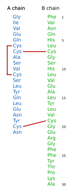 Primary structure of insulin with disulfide bonds highlighted in red.