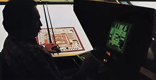 Engineer using an early IC-designing workstation to analyze a section of a circuit design cut on rubylith, circa 1979
