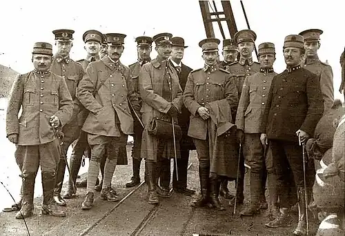 Captain Fabius, Major Kroon, Major De Waal (partly visible), Major Sluys, Captain Doorman, Major Roelfsema, Dr. De Groot (in civilian clothes), Captain Sar, Major Verhulst, Major Snellen van Vollenhoven and, far right, First Lieutenant Mallinckrodt on their arrival in Vlorë on 24 February 1914. The others are Albanian officers.