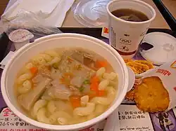 Hong Kong hosts some of the world's busiest McDonald's, with many operating 24 hours a day. Breakfasts include pasta soups with sausage or chicken.[8] Locations offer cups of corn as substitutes for French fries or à la carte. Desserts include soft serve ice cream in azuki bean and mung bean flavours; pineapple or red bean sundaes are sometimes offered.