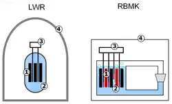 A simplified diagram comparing the Chernobyl RBMK and the most common nuclear reactor design, the Light water reactor. RBMK issues: 1. Using a graphite moderator in a water-cooled reactor, permitting criticality in a total loss of coolant accident. 2. A positive steam void coefficient that made the destructive power excursion possible. 3. Control rods design; taking 18–20 seconds to be fully inserted, and with graphite tips that increased reactivity initially. 4. No reinforced containment building.[2][10][11]